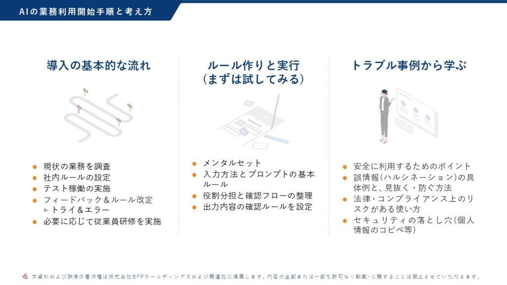 AIに限らずですが、こういった最新技術というのは「使うことが目的」ではなく、「使うことにより、どのようにして業務改善が図れるのか」が重要です。極端な話、AIを使っても業務量が中長期的に減らない・トラブルが頻発するのは導入することは害悪であります。この視点で言うとお伝えしておきたい要点は大きく分けて3つ。